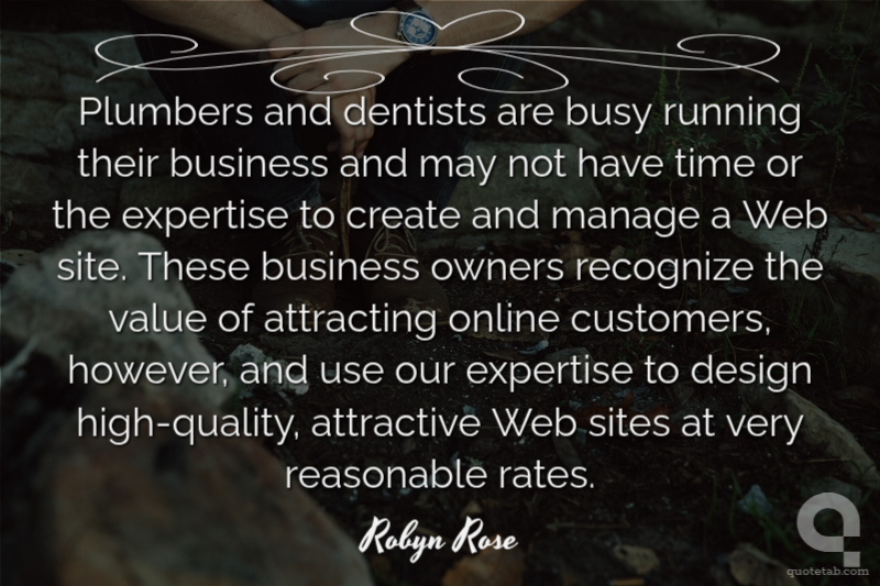 Plumbers and dentists are busy running their business and may not have time or the expertise to create and manage a Web site. These business owners recognize the value of attracting online customers, however, and use our expertise to design high-quality, attractive Web sites at very reasonable rates. Robyn Rose