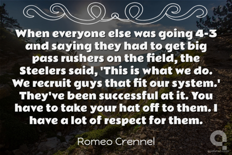 When everyone else was going 4-3 and saying they had to get big pass rushers on the field, the Steelers said, 'This is what we do. We recruit guys that fit our system.' They've been successful at it. You have to take your hat off to them. I have a lot of respect for them. Romeo Crennel