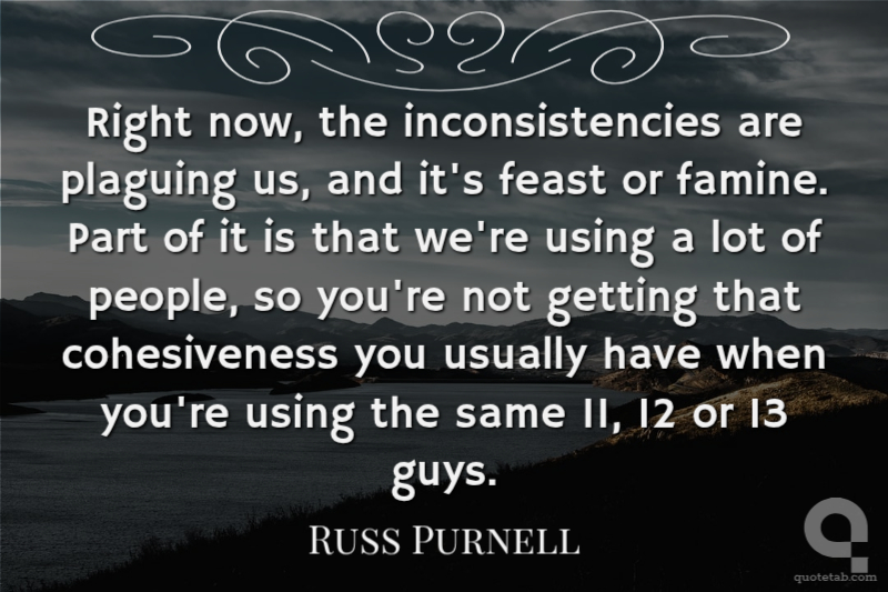 Right now, the inconsistencies are plaguing us, and it's feast or famine. Part of it is that we're using a lot of people, so you're not getting that cohesiveness you usually have when you're using the same 11, 12 or 13 guys. Russ Purnell
