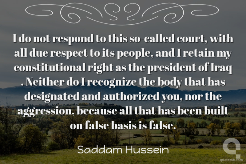 I do not respond to this so-called court, with all due respect to its people, and I retain my constitutional right as the president of Iraq . Neither do I recognize the body that has designated and authorized you, nor the aggression, because all that has been built on false basis is false. Saddam Hussein