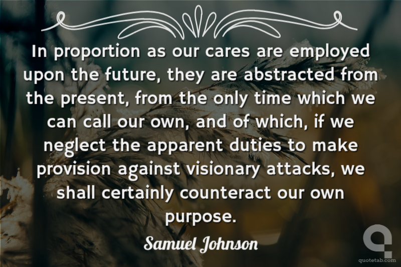 In proportion as our cares are employed upon the future, they are abstracted from the present, from the only time which we can call our own, and of which, if we neglect the apparent duties to make provision against visionary attacks, we shall certainly counteract our own purpose. Samuel Johnson