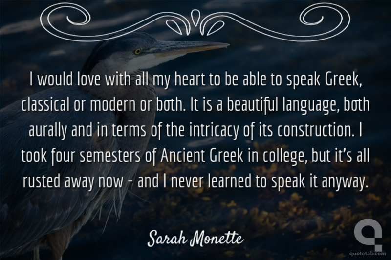 I would love with all my heart to be able to speak Greek, classical or modern or both. It is a beautiful language, both aurally and in terms of the intricacy of its construction. I took four semesters of Ancient Greek in college, but it's all rusted away now - and I never learned to speak it anyway. Sarah Monette