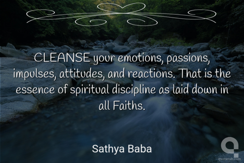 CLEANSE your emotions, passions, impulses, attitudes, and reactions. That is the essence of spiritual discipline as laid down in all Faiths. Sathya Baba