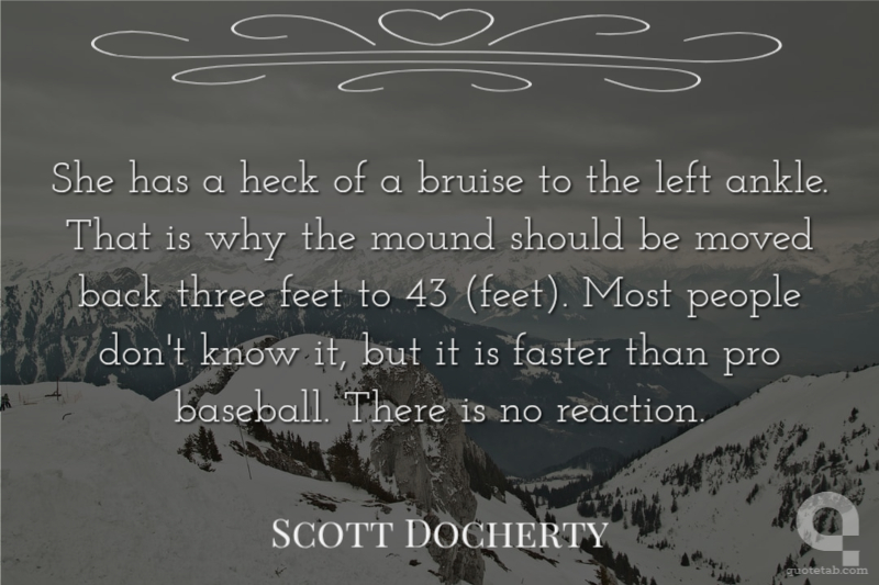 She has a heck of a bruise to the left ankle. That is why the mound should be moved back three feet to 43 (feet). Most people don't know it, but it is faster than pro baseball. There is no reaction. Scott Docherty