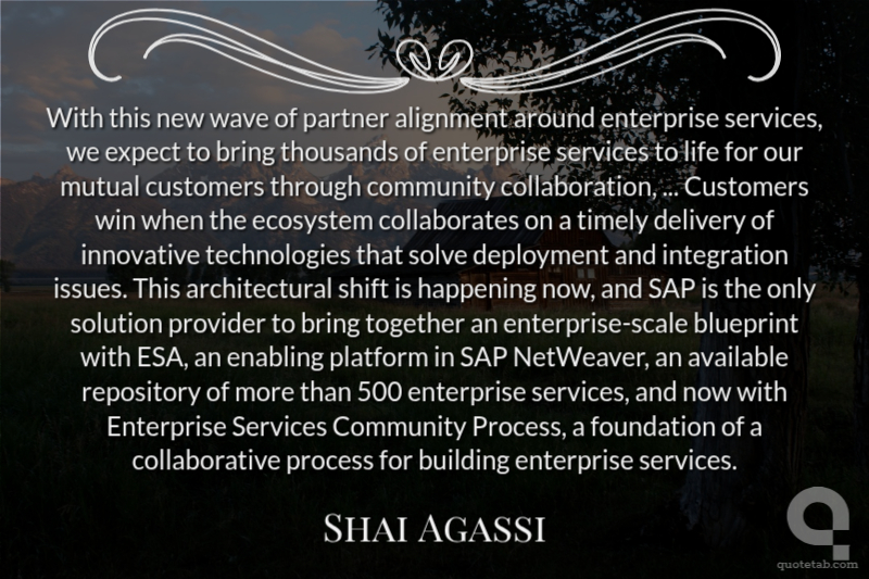 With this new wave of partner alignment around enterprise services, we expect to bring thousands of enterprise services to life for our mutual customers through community collaboration, ... Customers win when the ecosystem collaborates on a timely delivery of innovative technologies that solve deployment and integration issues. This architectural shift is happening now, and SAP is the only solution provider to bring together an enterprise-scale blueprint with ESA, an enabling platform in SAP NetWeaver, an available repository of more than 500 enterprise services, and now with Enterprise Services Community Process, a foundation of a collaborative process for building enterprise services. Shai Agassi