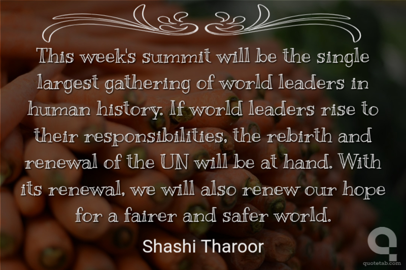 This week's summit will be the single largest gathering of world leaders in human history. If world leaders rise to their responsibilities, the rebirth and renewal of the UN will be at hand. With its renewal, we will also renew our hope for a fairer and safer world. Shashi Tharoor