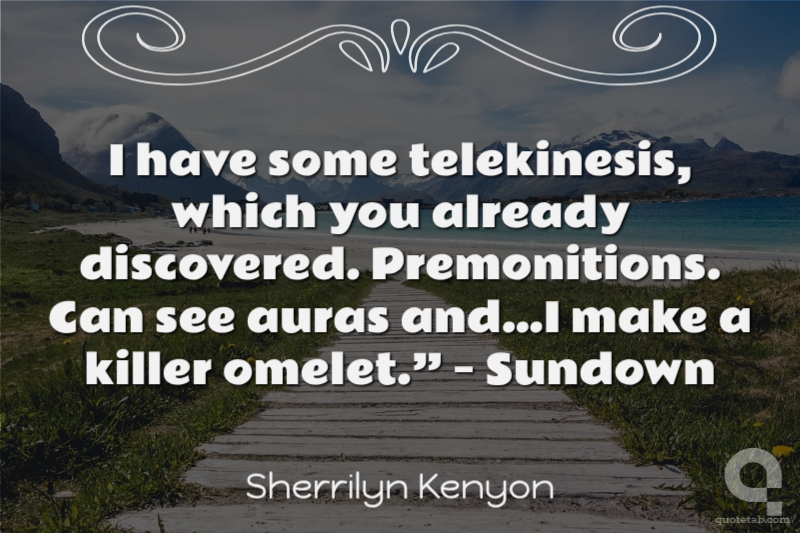 I have some telekinesis, which you already discovered. Premonitions. Can see auras and…I make a killer omelet.” – Sundown Sherrilyn Kenyon