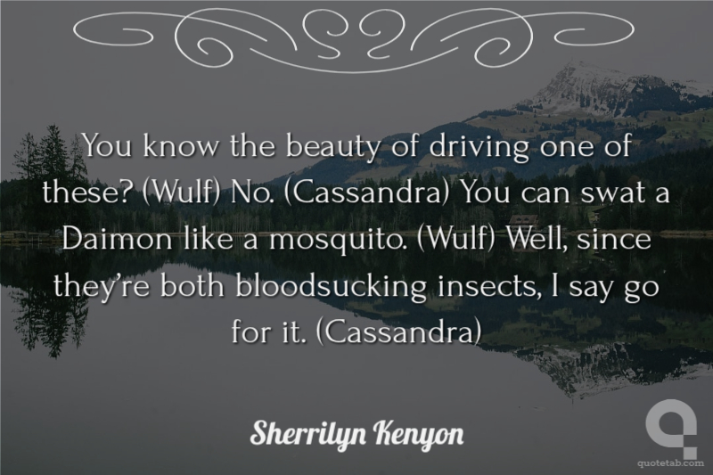 You know the beauty of driving one of these? (Wulf) No. (Cassandra) You can swat a Daimon like a mosquito. (Wulf) Well, since they’re both bloodsucking insects, I say go for it. (Cassandra) Sherrilyn Kenyon