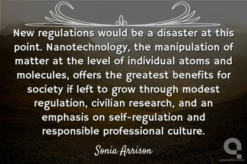 New regulations would be a disaster at this point. Nanotechnology, the manipulation of matter at the level of individual atoms and molecules, offers the greatest benefits for society if left to grow through modest regulation, civilian research, and an emphasis on self-regulation and responsible professional culture. Sonia Arrison