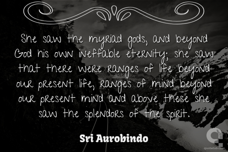 She saw the myriad gods, and beyond God his own ineffable eternity; she saw that there were ranges of life beyond our present life, ranges of mind beyond our present mind and above these she saw the splendors of the spirit. Sri Aurobindo
