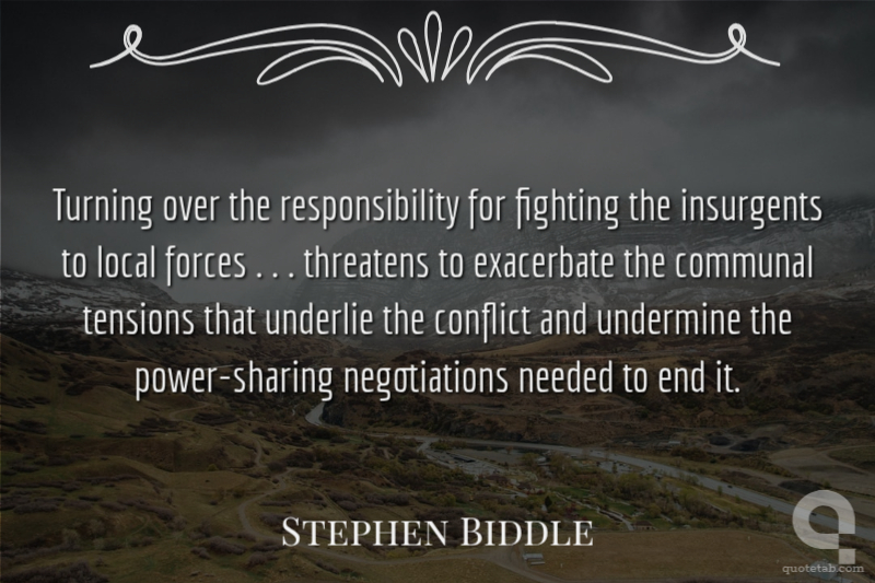 Turning over the responsibility for fighting the insurgents to local forces . . . threatens to exacerbate the communal tensions that underlie the conflict and undermine the power-sharing negotiations needed to end it. Stephen Biddle