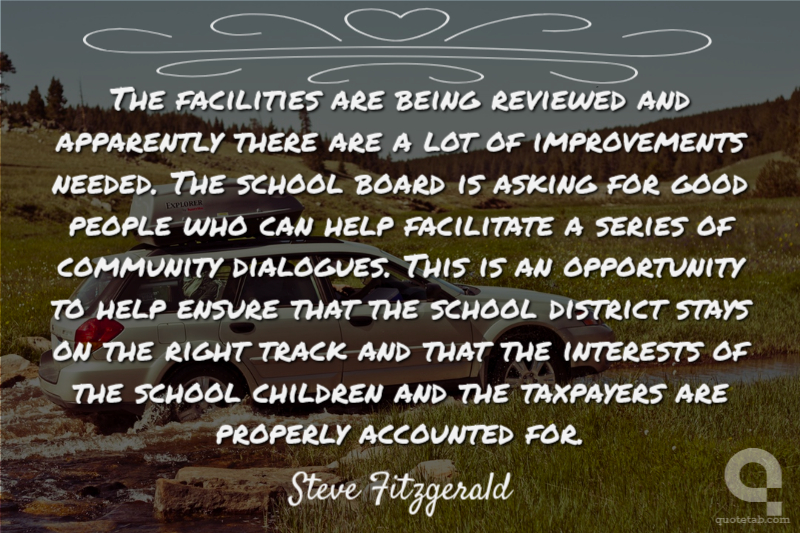 The facilities are being reviewed and apparently there are a lot of improvements needed. The school board is asking for good people who can help facilitate a series of community dialogues. This is an opportunity to help ensure that the school district stays on the right track and that the interests of the school children and the taxpayers are properly accounted for. Steve Fitzgerald