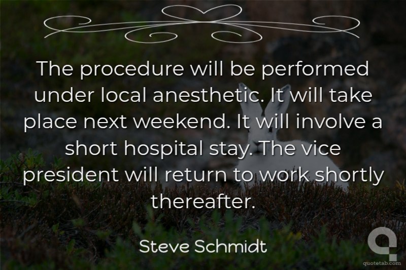 The procedure will be performed under local anesthetic. It will take place next weekend. It will involve a short hospital stay. The vice president will return to work shortly thereafter. Steve Schmidt
