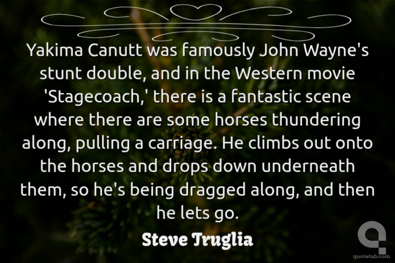 Yakima Canutt was famously John Wayne's stunt double, and in the Western movie 'Stagecoach,' there is a fantastic scene where there are some horses thundering along, pulling a carriage. He climbs out onto the horses and drops down underneath them, so he's being dragged along, and then he lets go. Steve Truglia