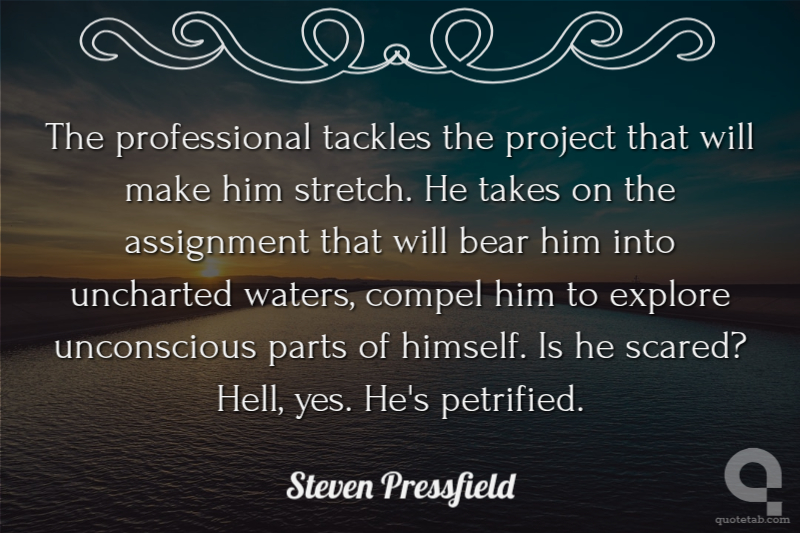 The professional tackles the project that will make him stretch. He takes on the assignment that will bear him into uncharted waters, compel him to explore unconscious parts of himself. Is he scared? Hell, yes. He's petrified. Steven Pressfield