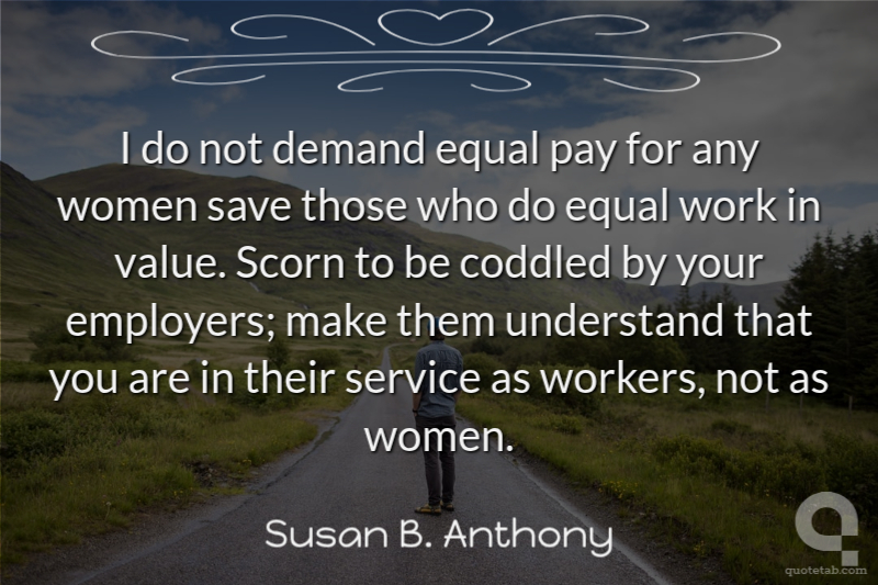 I do not demand equal pay for any women save those who do equal work in value. Scorn to be coddled by your employers; make them understand that you are in their service as workers, not as women. Susan B. Anthony