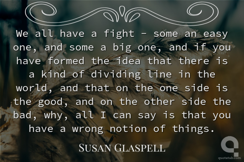 We all have a fight - some an easy one, and some a big one, and if you have formed the idea that there is a kind of dividing line in the world, and that on the one side is the good, and on the other side the bad, why, all I can say is that you have a wrong notion of things. Susan Glaspell