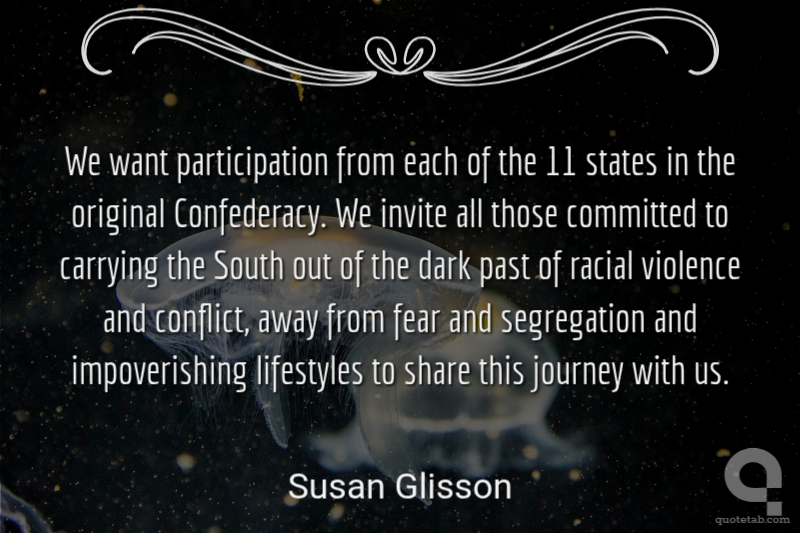 We want participation from each of the 11 states in the original Confederacy. We invite all those committed to carrying the South out of the dark past of racial violence and conflict, away from fear and segregation and impoverishing lifestyles to share this journey with us. Susan Glisson