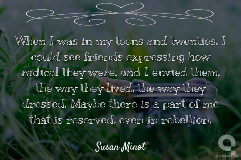 When I was in my teens and twenties, I could see friends expressing how radical they were, and I envied them, the way they lived, the way they dressed. Maybe there is a part of me that is reserved, even in rebellion. Susan Minot