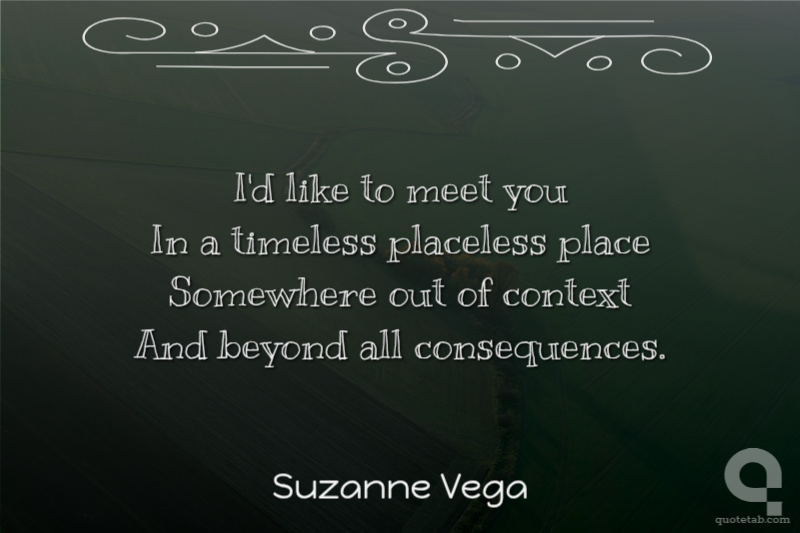 I'd like to meet you In a timeless placeless place Somewhere out of context And beyond all consequences. Suzanne Vega