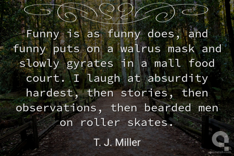 Funny is as funny does, and funny puts on a walrus mask and slowly gyrates in a mall food court. I laugh at absurdity hardest, then stories, then observations, then bearded men on roller skates. T. J. Miller