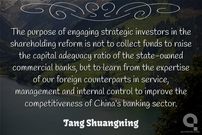 The purpose of engaging strategic investors in the shareholding reform is not to collect funds to raise the capital adequacy ratio of the state-owned commercial banks, but to learn from the expertise of our foreign counterparts in service, management and internal control to improve the competitiveness of China's banking sector. Tang Shuangning