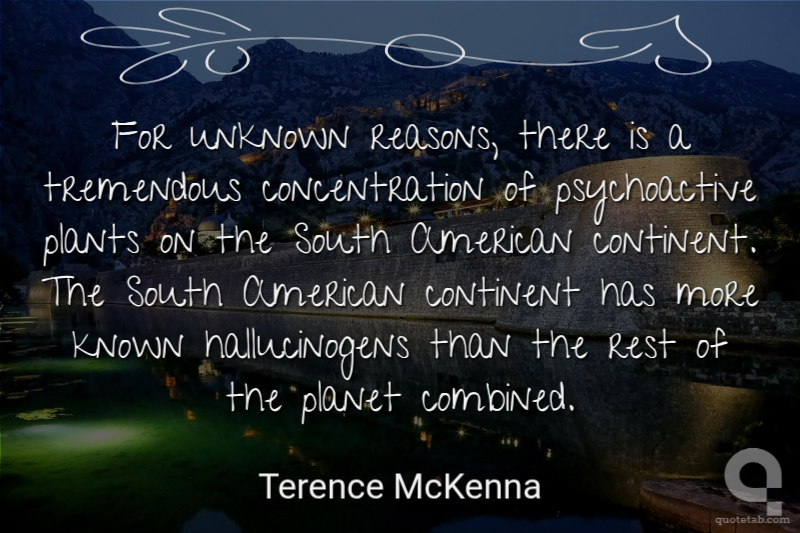 For unknown reasons, there is a tremendous concentration of psychoactive plants on the South American continent. The South American continent has more known hallucinogens than the rest of the planet combined. Terence McKenna
