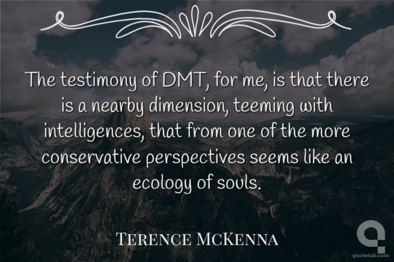 The testimony of DMT, for me, is that there is a nearby dimension, teeming with intelligences, that from one of the more conservative perspectives seems like an ecology of souls. Terence McKenna