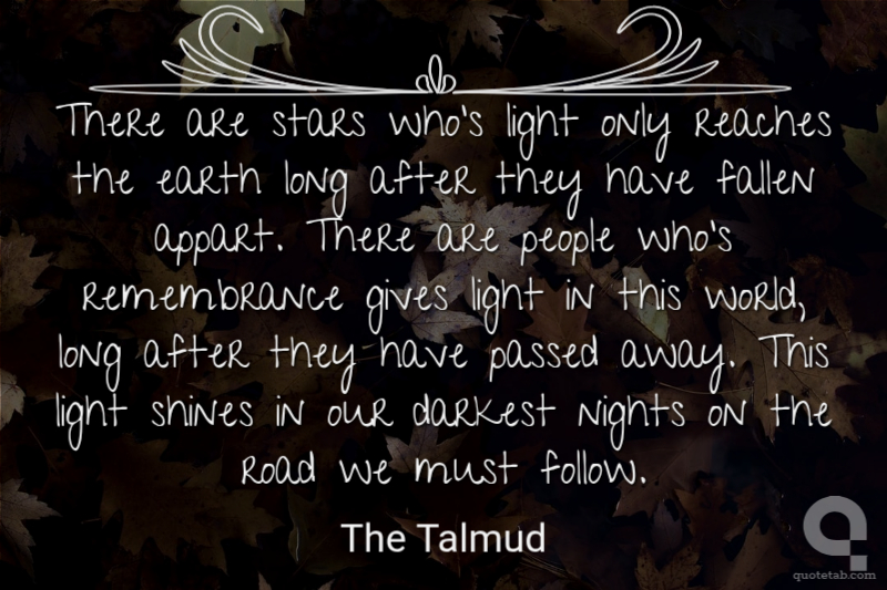 There are stars who's light only reaches the earth long after they have fallen appart. There are people who's remembrance gives light in this world, long after they have passed away. This light shines in our darkest nights on the road we must follow. The Talmud