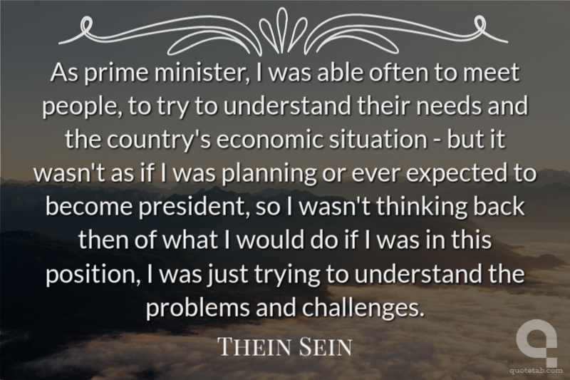 As prime minister, I was able often to meet people, to try to understand their needs and the country's economic situation - but it wasn't as if I was planning or ever expected to become president, so I wasn't thinking back then of what I would do if I was in this position, I was just trying to understand the problems and challenges. Thein Sein