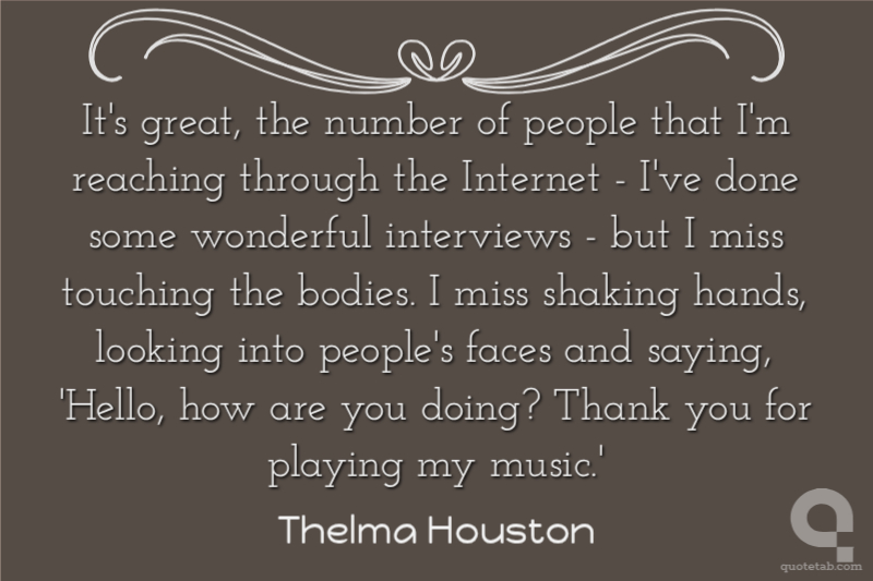 It's great, the number of people that I'm reaching through the Internet - I've done some wonderful interviews - but I miss touching the bodies. I miss shaking hands, looking into people's faces and saying, 'Hello, how are you doing? Thank you for playing my music.' Thelma Houston