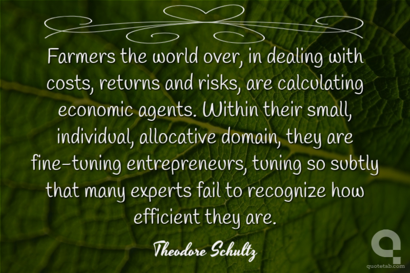 Farmers the world over, in dealing with costs, returns and risks, are calculating economic agents. Within their small, individual, allocative domain, they are fine-tuning entrepreneurs, tuning so subtly that many experts fail to recognize how efficient they are. Theodore Schultz
