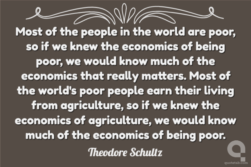 Most of the people in the world are poor, so if we knew the economics of being poor, we would know much of the economics that really matters. Most of the world's poor people earn their living from agriculture, so if we knew the economics of agriculture, we would know much of the economics of being poor. Theodore Schultz