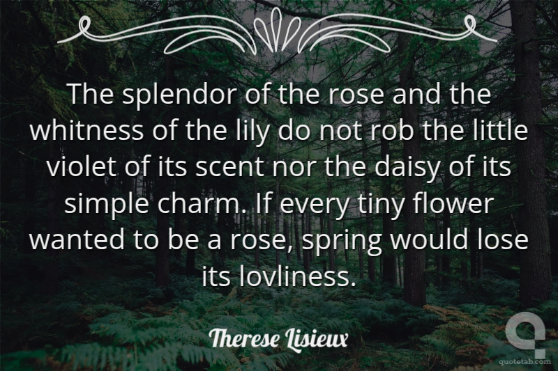 The splendor of the rose and the whitness of the lily do not rob the little violet of its scent nor the daisy of its simple charm. If every tiny flower wanted to be a rose, spring would lose its lovliness. Therese Lisieux
