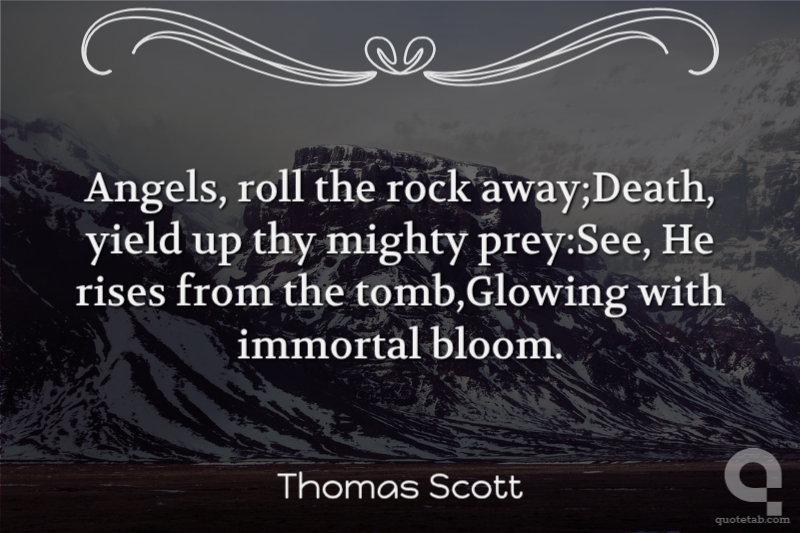 Angels, roll the rock away;Death, yield up thy mighty prey:See, He rises from the tomb,Glowing with immortal bloom. Thomas Scott