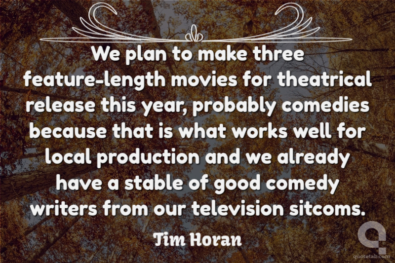We plan to make three feature-length movies for theatrical release this year, probably comedies because that is what works well for local production and we already have a stable of good comedy writers from our television sitcoms. Tim Horan