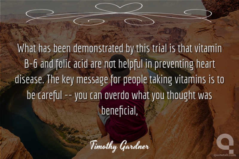 What has been demonstrated by this trial is that vitamin B-6 and folic acid are not helpful in preventing heart disease. The key message for people taking vitamins is to be careful -- you can overdo what you thought was beneficial, Timothy Gardner