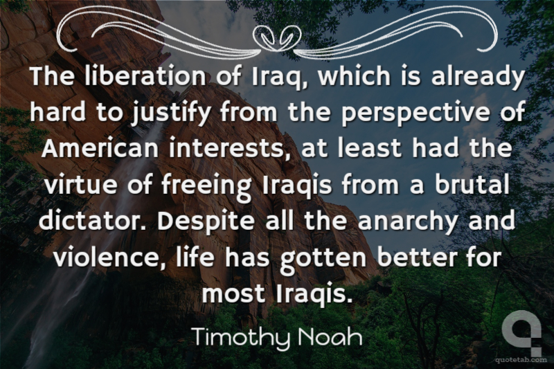 The liberation of Iraq, which is already hard to justify from the perspective of American interests, at least had the virtue of freeing Iraqis from a brutal dictator. Despite all the anarchy and violence, life has gotten better for most Iraqis. Timothy Noah