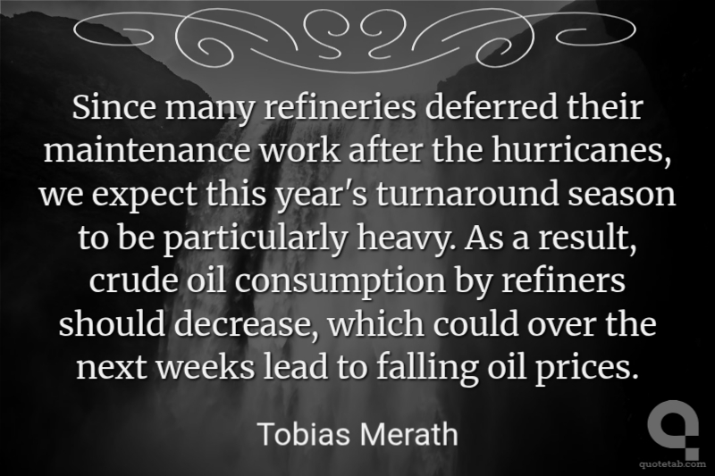 Since many refineries deferred their maintenance work after the hurricanes, we expect this year's turnaround season to be particularly heavy. As a result, crude oil consumption by refiners should decrease, which could over the next weeks lead to falling oil prices. Tobias Merath