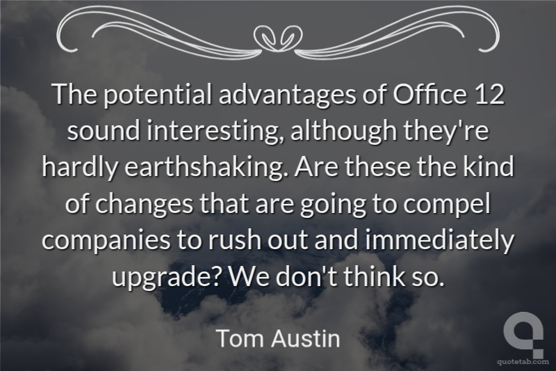 The potential advantages of Office 12 sound interesting, although they're hardly earthshaking. Are these the kind of changes that are going to compel companies to rush out and immediately upgrade? We don't think so. Tom Austin