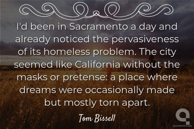 I'd been in Sacramento a day and already noticed the pervasiveness of its homeless problem. The city seemed like California without the masks or pretense: a place where dreams were occasionally made but mostly torn apart. Tom Bissell