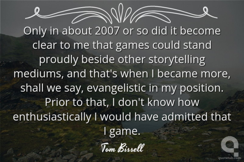 Only in about 2007 or so did it become clear to me that games could stand proudly beside other storytelling mediums, and that's when I became more, shall we say, evangelistic in my position. Prior to that, I don't know how enthusiastically I would have admitted that I game. Tom Bissell