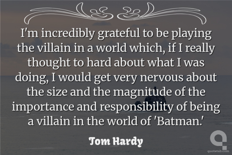I'm incredibly grateful to be playing the villain in a world which, if I really thought to hard about what I was doing, I would get very nervous about the size and the magnitude of the importance and responsibility of being a villain in the world of 'Batman.' Tom Hardy
