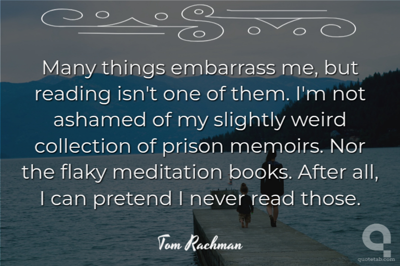Many things embarrass me, but reading isn't one of them. I'm not ashamed of my slightly weird collection of prison memoirs. Nor the flaky meditation books. After all, I can pretend I never read those. Tom Rachman