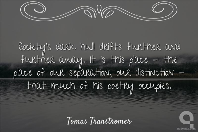 Society's dark hull drifts further and further away. It is this place - the place of our separation, our distinction - that much of his poetry occupies. Tomas Transtromer