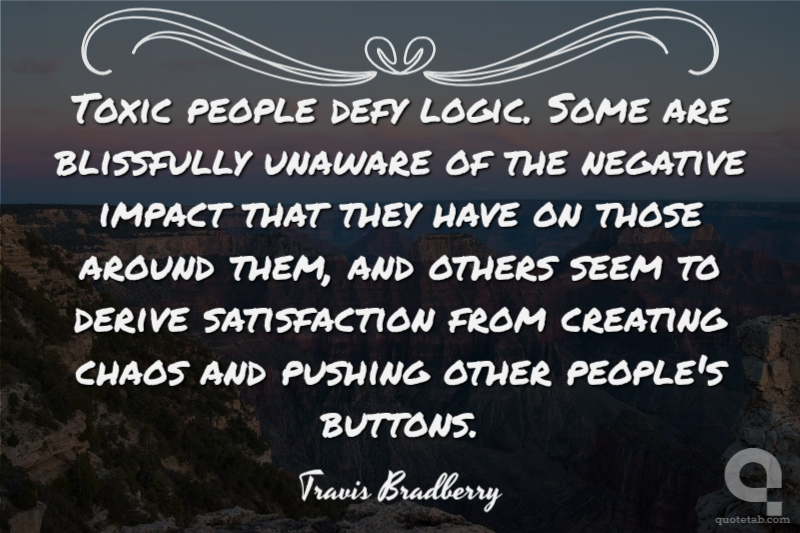 Toxic people defy logic. Some are blissfully unaware of the negative impact that they have on those around them, and others seem to derive satisfaction from creating chaos and pushing other people's buttons. Travis Bradberry