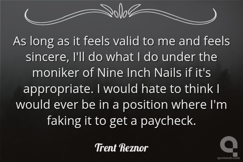 As long as it feels valid to me and feels sincere, I'll do what I do under the moniker of Nine Inch Nails if it's appropriate. I would hate to think I would ever be in a position where I'm faking it to get a paycheck. Trent Reznor