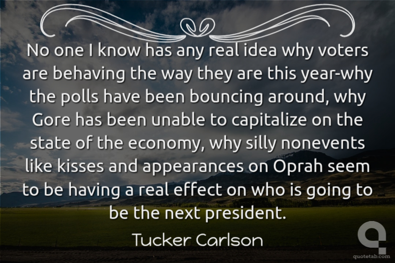 No one I know has any real idea why voters are behaving the way they are this year-why the polls have been bouncing around, why Gore has been unable to capitalize on the state of the economy, why silly nonevents like kisses and appearances on Oprah seem to be having a real effect on who is going to be the next president. Tucker Carlson