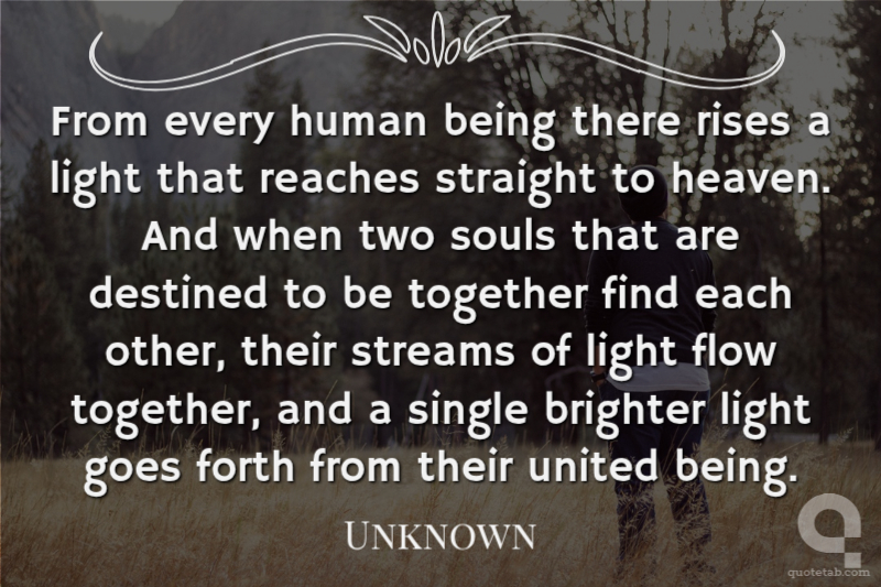 From every human being there rises a light that reaches straight to heaven. And when two souls that are destined to be together find each other, their streams of light flow together, and a single brighter light goes forth from their united being. Unknown