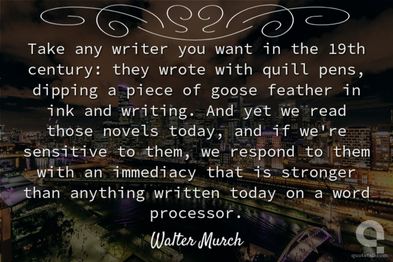 Take any writer you want in the 19th century: they wrote with quill pens, dipping a piece of goose feather in ink and writing. And yet we read those novels today, and if we're sensitive to them, we respond to them with an immediacy that is stronger than anything written today on a word processor. Walter Murch